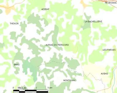 Outre le bourg d'Auriac-du-Périgord proprement dit, le territoire se compose d'autres villages ou hameaux, ainsi que de lieux-dits[32] :