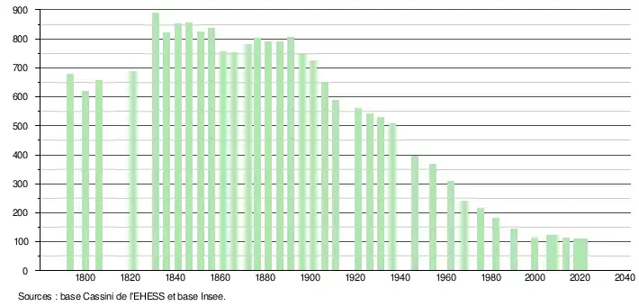 L'évolution du nombre d'habitants est connue à travers les recensements de la population effectués dans la commune depuis 1793. Pour les communes de moins de 10 000 habitants, une enquête de recensement portant sur toute la population est réalisée tous les cinq ans, les populations légales des années intermédiaires étant quant à elles estimées par interpolation ou extrapolation[21]. Pour la commune, le premier recensement exhaustif entrant dans le cadre du nouveau dispositif a été réalisé en 2008[22].