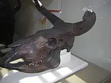 Le crâne était volumineux, avec un front plat et étroit muni de grandes cornes en forme de lyre, tournées vers l'avant en faisant un angle d'environ soixante degrés avec le front. La pointe pouvait parfois remonter vers le haut[33]. La forme précise de ces cornes pouvait légèrement varier d'un individu à l'autre. Celles des mâles pouvaient aller jusqu'à cent sept centimètres de longueur[34], quand celles des femelles étaient plus petites, jusqu'à soixante dix centimètres de longueur[30]. Claude Guintard indique même une taille maximale pour les mâles de cent vingt centimètres, mais des tailles moyennes bien inférieures à ces maximums : soixante deux centimètres pour les mâles, et quarante deux pour les femelles[35].