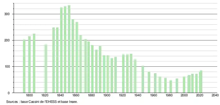 | L'évolution du nombre d'habitants est connue à travers les recensements de la population effectués dans la commune depuis 1793. Pour les communes de moins de 10 000 habitants, une enquête de recensement portant sur toute la population est réalisée tous les cinq ans, les populations légales des années intermédiaires étant quant à elles estimées par interpolation ou extrapolation[30]. Pour la commune, le premier recensement exhaustif entrant dans le cadre du nouveau dispositif a été réalisé en 2005[31]. En 2021, la commune comptait 85 habitants[Note 6], en augmentation de 18,06 % par rapport à 2015 (Haute-Garonne : +7,43 %, France hors Mayotte : +1,84 %). |