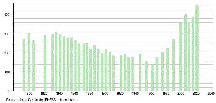 L'évolution du nombre d'habitants est connue à travers les recensements de la population effectués dans la commune depuis 1793. Pour les communes de moins de 10 000 habitants, une enquête de recensement portant sur toute la population est réalisée tous les cinq ans, les populations légales des années intermédiaires étant quant à elles estimées par interpolation ou extrapolation[24]. Pour la commune, le premier recensement exhaustif entrant dans le cadre du nouveau dispositif a été réalisé en 2005[25].