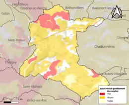 Le retrait-gonflement des sols argileux est susceptible d'engendrer des dommages importants aux bâtiments en cas d’alternance de périodes de sécheresse et de pluie. 78,8 % de la superficie communale est en aléa moyen ou fort (52,8 % au niveau départemental et 48,5 % au niveau national). Sur les 919 bâtiments dénombrés sur la commune en 2019, 669 sont en aléa moyen ou fort, soit 73 %, à comparer aux 70 % au niveau départemental et 54 % au niveau national. Une cartographie de l'exposition du territoire national au retrait gonflement des sols argileux est disponible sur le site du BRGM[19],[Carte 1].