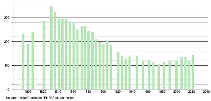 L'évolution du nombre d'habitants est connue à travers les recensements de la population effectués dans la commune depuis 1793. Pour les communes de moins de 10 000 habitants, une enquête de recensement portant sur toute la population est réalisée tous les cinq ans, les populations légales des années intermédiaires étant quant à elles estimées par interpolation ou extrapolation[21]. Pour la commune, le premier recensement exhaustif entrant dans le cadre du nouveau dispositif a été réalisé en 2006[22].