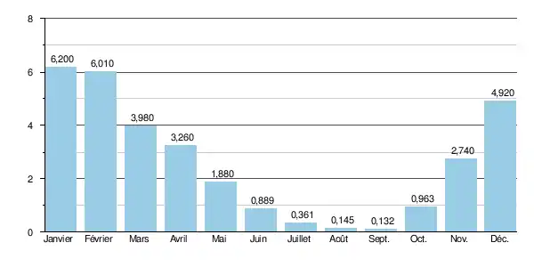 Sur cette période d'observation de 44 ans, le débit journalier maximal a été observé le pour 48,80 m3/s. Le débit instantané maximal a été observé le [note 1] avec 65,90 m3/s en même temps que la hauteur maximale instantanée de 303 mm soit 3,03 m[2].