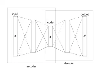 La forme la plus simple d'un auto-encodeur est un réseau de neurones non récurrents qui se propage vers l'avant, très semblable au perceptron multicouches. L'auto-encodeur a une couche d'entrée , une couche de sortie ainsi qu'une ou plusieurs couches cachées les reliant. Toutefois la couche de sortie possède le même nombre de nœuds que la couche d'entrée ; autrement dit et ont le même nombre de dimensions. Le code (aussi appelé variables latentes ou représentation latente) est la couche cachée la plus interne. Elle représente mais dans un espace avec moins de dimensions.