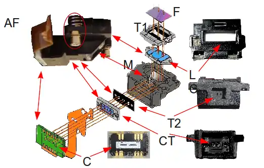 Le module autofocus fait en moyenne environ 10 mm de hauteur et 25 mm de longueur. On peut y observer des vis de réglage liées à des ressorts.
