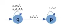 L'automate a deux états ; l'état est initial, il n'y a pas d'état terminal. La reconnaissance est par pile vide. Le symbole de fond de pile est . Il y a un seul symbole de pile supplémentaire, noté . Les transitions sont :
