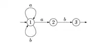 L'automate est dit « fini » car il possède un nombre fini d'états : il ne dispose donc que d'une mémoire bornée. On peut très bien considérer des automates sans limitation sur le nombre d'états : la théorie qui en résulte est très analogue à la théorie habituelle. Un automate fini peut être vu comme un graphe orienté étiqueté : les états sont les sommets et les transitions sont les arêtes étiquetées. L'état initial est marqué par une flèche entrante ; un état final est, selon les auteurs, soit doublement cerclé (dans la figure 1 ci-dessus, l'état est à la fois initial et final), soit marqué d'une flèche sortante (dans la figure 2 ci-dessous, 1 est initial et 3 est final).