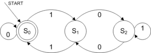 - L'automate du début de l'article reconnaît les écritures binaire des entiers naturels multiples de 3. Par exemple, le nombre 18, dont l'écriture binaire est , est reconnu : le calcul est