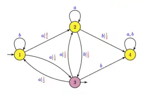 De plus, chaque transition de porte un nombre réel positif , appelé sa probabilité, avec la condition que, pour chaque état et chaque lettre , la somme des , pour dans , est égal à 1.