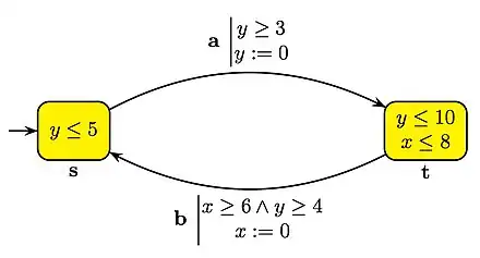 L'automate temporisé ci-contre est composé de deux états et . L'état est l'état initial. Il y a deux transitions étiquetées respectivement par les lettres d'entrée et . L'automate a aussi deux horloges et . L'invariant de l'état indique que l'horloge peut valoir au plus 5. Quand elle est au moins égale à 3, la transition vers l'état peut être effectuée. Cette transition entraîne que la réinitialisation de l’horloge , i.e. l'horloge est remise à zéro.