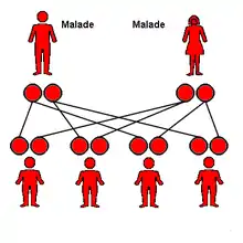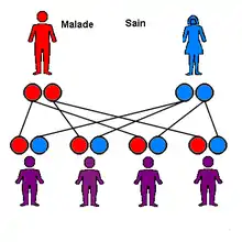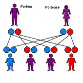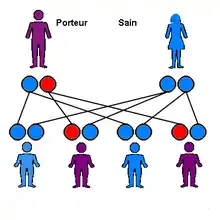 Dans les schémas, les gamètes porteurs de l'allèle normal (sauvage) sont en bleu, les gamètes porteurs de l'allèle anormal sont en rouge. Les personnes porteuses du gène anormal sur deux allèles (et donc susceptible de développer la maladie) sont en rouge, les personnes porteuses du gène anormal sur un seul allèle (dites porteuses saines ou conductrices) sont en violet, les personnes non porteuses du gène anormal sont en bleu.