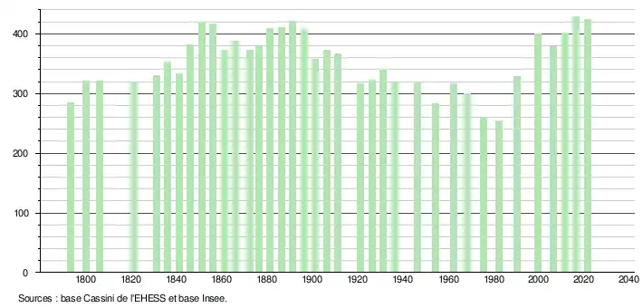 L'évolution du nombre d'habitants est connue à travers les recensements de la population effectués dans la commune depuis 1793. Pour les communes de moins de 10 000 habitants, une enquête de recensement portant sur toute la population est réalisée tous les cinq ans, les populations légales des années intermédiaires étant quant à elles estimées par interpolation ou extrapolation[20]. Pour la commune, le premier recensement exhaustif entrant dans le cadre du nouveau dispositif a été réalisé en 2006[21].