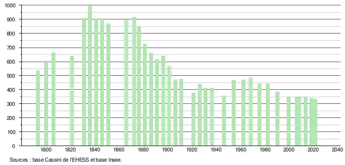 L'évolution du nombre d'habitants est connue à travers les recensements de la population effectués dans la commune depuis 1793. Pour les communes de moins de 10 000 habitants, une enquête de recensement portant sur toute la population est réalisée tous les cinq ans, les populations légales des années intermédiaires étant quant à elles estimées par interpolation ou extrapolation[16]. Pour la commune, le premier recensement exhaustif entrant dans le cadre du nouveau dispositif a été réalisé en 2008[17].