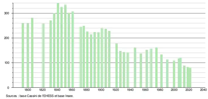 L'évolution du nombre d'habitants est connue à travers les recensements de la population effectués dans la commune depuis 1793. Pour les communes de moins de 10 000 habitants, une enquête de recensement portant sur toute la population est réalisée tous les cinq ans, les populations légales des années intermédiaires étant quant à elles estimées par interpolation ou extrapolation[18]. Pour la commune, le premier recensement exhaustif entrant dans le cadre du nouveau dispositif a été réalisé en 2008[19].