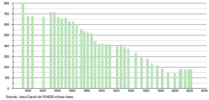 L'évolution du nombre d'habitants est connue à travers les recensements de la population effectués dans la commune depuis 1793. Pour les communes de moins de 10 000 habitants, une enquête de recensement portant sur toute la population est réalisée tous les cinq ans, les populations légales des années intermédiaires étant quant à elles estimées par interpolation ou extrapolation[27]. Pour la commune, le premier recensement exhaustif entrant dans le cadre du nouveau dispositif a été réalisé en 2008[28].