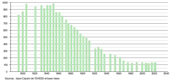 L'évolution du nombre d'habitants est connue à travers les recensements de la population effectués dans la commune depuis 1793. Pour les communes de moins de 10 000 habitants, une enquête de recensement portant sur toute la population est réalisée tous les cinq ans, les populations légales des années intermédiaires étant quant à elles estimées par interpolation ou extrapolation[15]. Pour la commune, le premier recensement exhaustif entrant dans le cadre du nouveau dispositif a été réalisé en 2005[16].