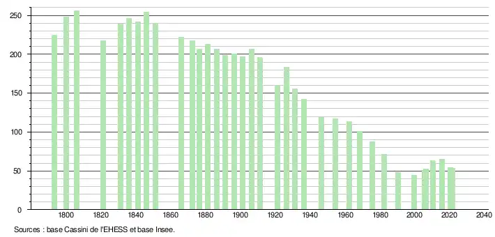 L'évolution du nombre d'habitants est connue à travers les recensements de la population effectués dans la commune depuis 1793. Pour les communes de moins de 10 000 habitants, une enquête de recensement portant sur toute la population est réalisée tous les cinq ans, les populations légales des années intermédiaires étant quant à elles estimées par interpolation ou extrapolation[17]. Pour la commune, le premier recensement exhaustif entrant dans le cadre du nouveau dispositif a été réalisé en 2005[18].
