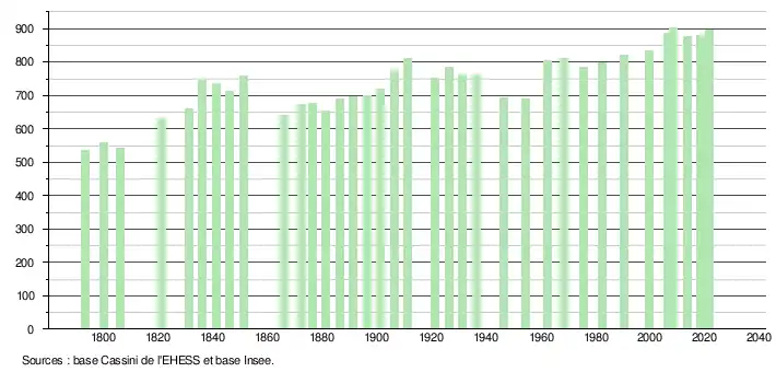 L'évolution du nombre d'habitants est connue à travers les recensements de la population effectués dans la commune depuis 1793. Pour les communes de moins de 10 000 habitants, une enquête de recensement portant sur toute la population est réalisée tous les cinq ans, les populations légales des années intermédiaires étant quant à elles estimées par interpolation ou extrapolation[19]. Pour la commune, le premier recensement exhaustif entrant dans le cadre du nouveau dispositif a été réalisé en 2008[20].