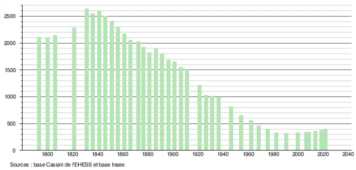 L'occupation des sols de la commune, telle qu'elle ressort de la base de données européenne d’occupation biophysique des sols Corine Land Cover (CLC), est marquée par l'importance des forêts et milieux semi-naturels (64,7 % en 2018), une proportion identique à celle de 1990 (64,6 %). La répartition détaillée en 2018 est la suivante : forêts (63,9 %), prairies (33,6 %), zones agricoles hétérogènes (1,7 %), milieux à végétation arbustive et/ou herbacée (0,8 %)[13]. L'évolution de l’occupation des sols de la commune et de ses infrastructures peut être observée sur les différentes représentations cartographiques du territoire : la carte de Cassini (XVIIIe siècle), la carte d'état-major (1820-1866) et les cartes ou photos aériennes de l'IGN pour la période actuelle (1950 à aujourd'hui)[Carte 1].
