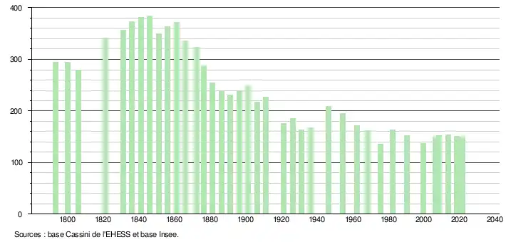 L'évolution du nombre d'habitants est connue à travers les recensements de la population effectués dans la commune depuis 1793. Pour les communes de moins de 10 000 habitants, une enquête de recensement portant sur toute la population est réalisée tous les cinq ans, les populations légales des années intermédiaires étant quant à elles estimées par interpolation ou extrapolation[21]. Pour la commune, le premier recensement exhaustif entrant dans le cadre du nouveau dispositif a été réalisé en 2008[22].