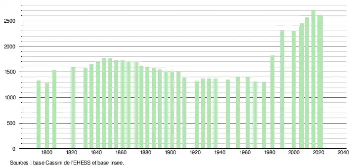 L'évolution du nombre d'habitants est connue à travers les recensements de la population effectués dans la commune depuis 1793. Pour les communes de moins de 10 000 habitants, une enquête de recensement portant sur toute la population est réalisée tous les cinq ans, les populations légales des années intermédiaires étant quant à elles estimées par interpolation ou extrapolation[34]. Pour la commune, le premier recensement exhaustif entrant dans le cadre du nouveau dispositif a été réalisé en 2005[35].