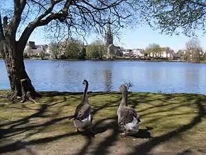 Les eaux de l'Aven sortant de l'étang de Rosporden : la vanne et le déversoir