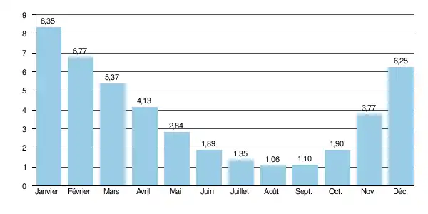La lame d'eau écoulée dans son bassin versant annuellement présente une valeur élevée puisqu'elle est égale à 714 mm. Celle-ci s'explique par l'abondance des précipitations sur l'ensemble de son bassin versant et par la présence de terrains en forte pente favorisant un écoulement rapide des eaux.