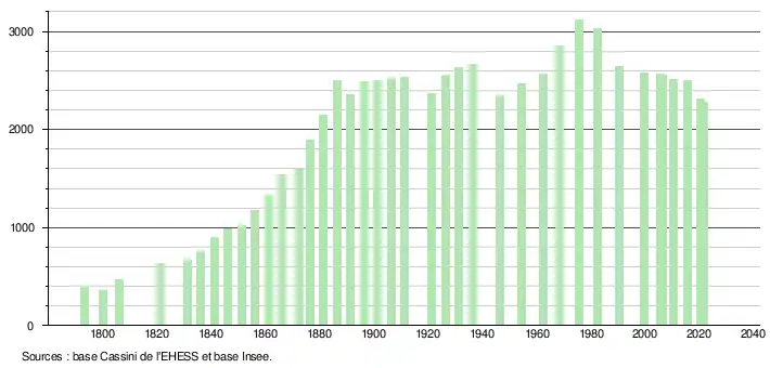 - Population municipale légale en vigueur au 1er janvier 2024, millésimée 2021, définie dans les limites territoriales en vigueur au 1er janvier 2023, date de référence statistique : 1er janvier 2021.