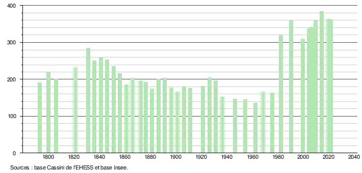 L'évolution du nombre d'habitants est connue à travers les recensements de la population effectués dans la commune depuis 1793. Pour les communes de moins de 10 000 habitants, une enquête de recensement portant sur toute la population est réalisée tous les cinq ans, les populations légales des années intermédiaires étant quant à elles estimées par interpolation ou extrapolation[15]. Pour la commune, le premier recensement exhaustif entrant dans le cadre du nouveau dispositif a été réalisé en 2004[16].