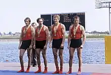 Les Soviétiques Alexei Kamkin, Valery Dolinin, Alexei Kulagin et Vitaly Eliseyev médaillés d'argent en quatre sans barreur.
