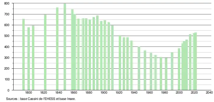 L'évolution du nombre d'habitants est connue à travers les recensements de la population effectués dans la commune depuis 1793. Pour les communes de moins de 10 000 habitants, une enquête de recensement portant sur toute la population est réalisée tous les cinq ans, les populations légales des années intermédiaires étant quant à elles estimées par interpolation ou extrapolation[20]. Pour la commune, le premier recensement exhaustif entrant dans le cadre du nouveau dispositif a été réalisé en 2004[21].