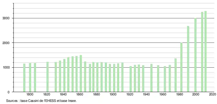 - Dans le tableau des recensements et le graphique, par convention dans Wikipédia, le principe a été retenu, pour les populations légales postérieures à 1999 de n’afficher dans le tableau des recensements et le graphique que les populations correspondant à l'année 2006, première population légale publiée calculée conformément aux concepts définis dans le décret no 2003-485 du 5 juin 2003, et les années correspondant à une enquête exhaustive de recensement pour les communes de moins de 10 000 habitants, ainsi que la dernière population légale publiée par l’Insee.