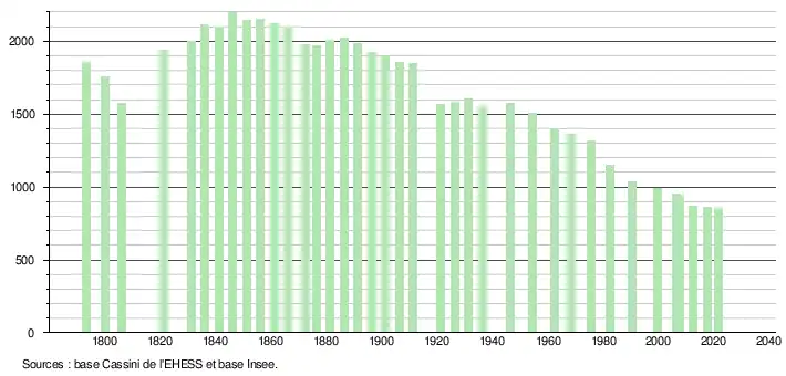 L'évolution du nombre d'habitants est connue à travers les recensements de la population effectués dans la commune depuis 1793. Pour les communes de moins de 10 000 habitants, une enquête de recensement portant sur toute la population est réalisée tous les cinq ans, les populations légales des années intermédiaires étant quant à elles estimées par interpolation ou extrapolation[36]. Pour la commune, le premier recensement exhaustif entrant dans le cadre du nouveau dispositif a été réalisé en 2007[37].