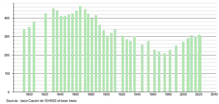 L'évolution du nombre d'habitants est connue à travers les recensements de la population effectués dans la commune depuis 1793. Pour les communes de moins de 10 000 habitants, une enquête de recensement portant sur toute la population est réalisée tous les cinq ans, les populations légales des années intermédiaires étant quant à elles estimées par interpolation ou extrapolation[33]. Pour la commune, le premier recensement exhaustif entrant dans le cadre du nouveau dispositif a été réalisé en 2005[34].