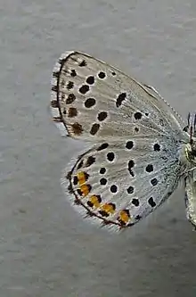 Le revers est beige très peu suffusé de bleu et orné de lignes de petits points noirs. L'aile postérieure présente de plus une ligne submarginale de points orange[2].