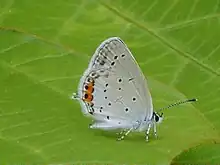 Le revers est gris pâle un peu suffusé de bleu et orné de lignes de petits points noirs cernés de blanc et à l'aile postérieure deux taches marginales orange.
