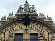 La façade du bâtiment est couronnée par le groupe sculpté Barcelone protège la Marine et le Commerce, œuvre de Joan Serra Pau de 1907. Le reste du couronnement de l'édifice a aussi un décor sculpté centré sur les motifs marins, comme des tritons, des embarcations et une effigie de Poséidón, ainsi que des cornes d'abondances[3].
