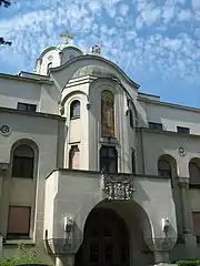 Le bâtiment du Patriarcat de Belgrade, situé 6 rue Kneza Sime Markovića, a été construit entre 1933 et 1935 d'après un projet de l'architecte russe Viktor Lukomski, à l'emplacement de l'ancien archiépiscopat bâti en 1863. Il a été construit dans une version moderne du style serbo-byzantin. Il est orné de colonnes stylisées, de fenêtres regroupées par deux, de médaillons, de consoles et d'ouvertures voûtées, qui sont une libre adaptation par l'architecte des anciens modèles. L'entrée principale est particulièrement soignée, conçue dans un style monumental, avec des colonnes miniatures situées dans des niches voûtées et l'emblème de l'Église orthodoxe serbe. Au-dessus de l'entrée se trouve aussi une grande mosaïque représentant Saint Jean Baptiste, réalisée d'après un dessin du peintre Vladimir Predojević. Le rez-de-chaussée est constitué d'arcades portées par des colonnes et des chapiteaux inspirés de l'art byzantin. L'édifice abrite une chapelle dédiée à saint Siméon le myrthophore, la bibliothèque du patriarcat et le Musée de l'Église orthodoxe serbe[2].