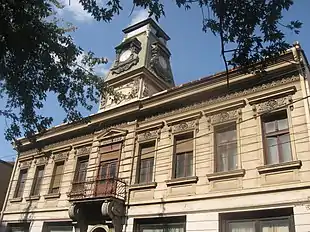 La partie centrale de la façade sur l'Obilićev venac est dominée par une tour horloge ; cette partie centrale, où se trouve le portail d'entrée, est ornée d'une fenêtre ouvrant sur un balcon et surmontée d'un tympan triangulaire[3]. Elle divise la façade sur rue en deux parties symétriques[3].