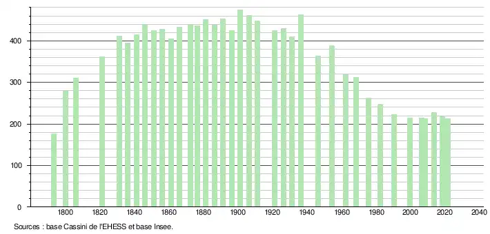 L'évolution du nombre d'habitants est connue à travers les recensements de la population effectués dans la commune depuis 1793. Pour les communes de moins de 10 000 habitants, une enquête de recensement portant sur toute la population est réalisée tous les cinq ans, les populations légales des années intermédiaires étant quant à elles estimées par interpolation ou extrapolation[38]. Pour la commune, le premier recensement exhaustif entrant dans le cadre du nouveau dispositif a été réalisé en 2008[39].