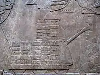 L'illustration du bélier assyrien montre à quel point les moyens d’attaques et de défense étaient devenus sophistiqués dès le IXe siècle av. J.-C. Les défenseurs tentent de mettre le feu au bélier avec des torches et également de glisser une chaîne sous le bélier. Les attaquants tentent de tirer sur la chaîne pour libérer le bélier, alors que les peaux humides susmentionnées permettaient de le protéger contre l'incendie.