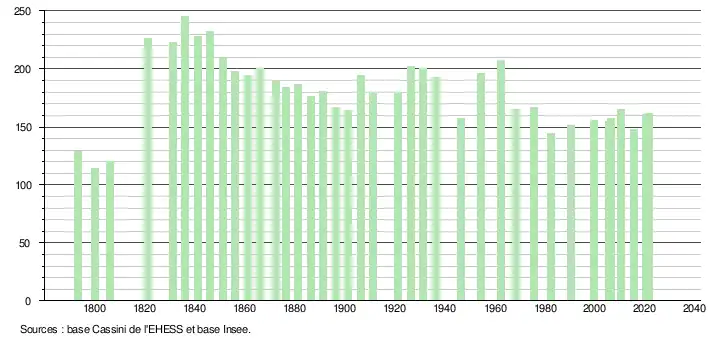 L'évolution du nombre d'habitants est connue à travers les recensements de la population effectués dans la commune depuis 1793. Pour les communes de moins de 10 000 habitants, une enquête de recensement portant sur toute la population est réalisée tous les cinq ans, les populations légales des années intermédiaires étant quant à elles estimées par interpolation ou extrapolation[23]. Pour la commune, le premier recensement exhaustif entrant dans le cadre du nouveau dispositif a été réalisé en 2005[24].