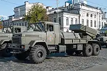 Ukraine (BM-21K Grad ") - Très peu de différences avec le BM-21 d'origine à part que le panier de 40 roquettes est monté sur un KrAZ-260 6x6. Le 1er prototype a été livré en 2009[19].