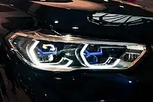 Une autre particularité est la lumière laser[16] : Les diode laser ne représentent qu'un dixième de la taille des LED conventionnelles. Néanmoins, ils brillent dix fois plus fort et donc deux fois plus loin – le feu de route devrait briller jusqu'à 600 mètres. Les faisceaux de diode laser bleu profond sont convertis en lumière blanche à une température de couleur de 5500 Kelvin avec l'aide d'un phosphore jaune[24]. Cela correspond à la température de couleur de la lumière du jour[25].