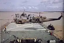 Sous le nom Harnett County dans les eaux vietnamiennes entre 1967 et 1970. On aperçoit sur sa plateforme d'envol un Sikorsky H-34 Choctaw (à gauche) et un hélicoptère d'attaque de l'US Navy k (à droite) "Seawolf" UH-1B Huey gunship. | ||