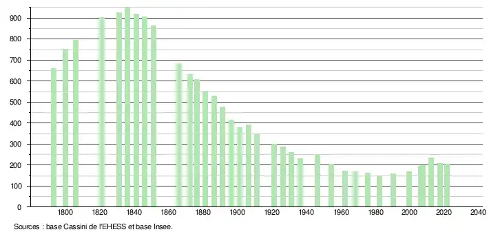 L'évolution du nombre d'habitants est connue à travers les recensements de la population effectués dans la commune depuis 1793. Pour les communes de moins de 10 000 habitants, une enquête de recensement portant sur toute la population est réalisée tous les cinq ans, les populations légales des années intermédiaires étant quant à elles estimées par interpolation ou extrapolation[33]. Pour la commune, le premier recensement exhaustif entrant dans le cadre du nouveau dispositif a été réalisé en 2007[34].