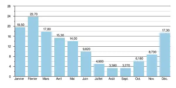 D'autre part, les crues de la Baïse peuvent être très importantes, d'autant plus que son bassin versant est assez étendu. Les QIX 2 et QIX 5 valent respectivement 150 et 220 m3/s. Le QIX 10 se monte à 270 m3/s, et le QIX 20 en vaut 320 m3/s. Quant au QIX 50, il se monte à pas moins de 380 m3/s, soit plus que le débit moyen de la Seine à Paris. Cela signifie en clair que statistiquement il doit y avoir une crue de 220 m3/s tous les cinq ans et de 270 m3/s tous les dix ans, ce qui est considérable.