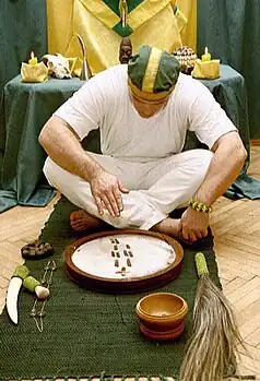 Un Babalawo (ou Babalao, ou Babaaláwo, prononcé Baba-a-láwo) est un prêtre d'Ifá, en langue yoruba. Ifa est un système de divination originaire d'Afrique de l'Ouest qui représente les enseignements de l'orisha Orunmila[1], orisha de la Sagesse. Les babalawo affirment s'assurer du futur au travers de leur communication avec Orunmila. Cette communication est effectuée au travers des formes prises par la chaîne de divination Opele (ekuelé) ou par des noix de palmiers appelées ikin sur le plateau de divination, traditionnellement en bois.