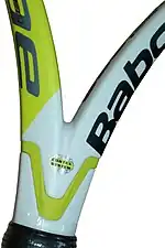 En 1980, une double ligne apposée en bas du tamis des raquettes signale un cordage Babolat[10].